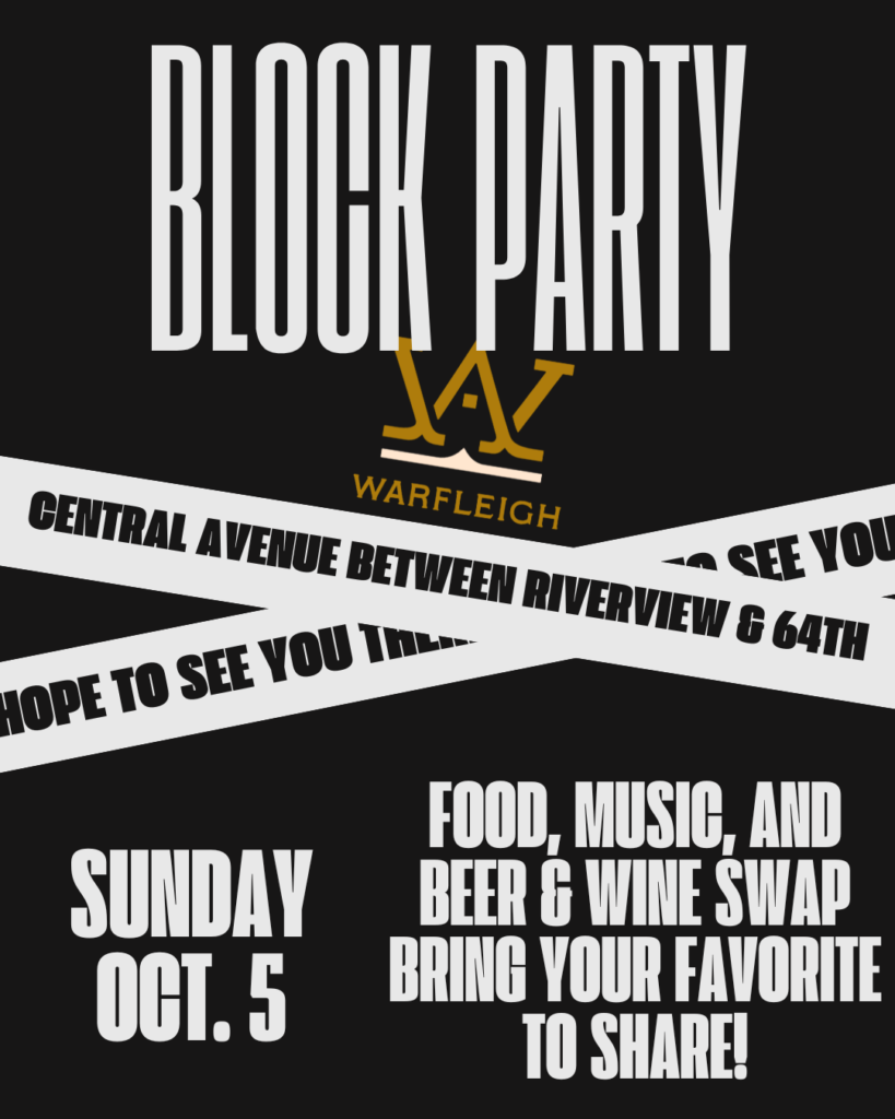 The annual block party will be Sunday October 5th from 4:00pm – 6:00pm on Central Avenue between Riverview Drive and 64th Street.